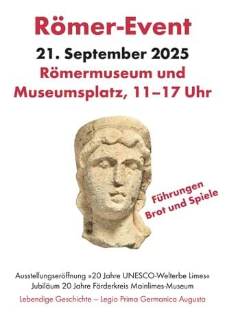 Der Förderkreis Mainlimes e.V. lädt ein zum Jubiläum 20 Jahre UNESCO-Welterbe Limes. Dazu eröffnet das Römermuseum die Sonderausstellung der Deutschen Limeskommission mit dem Titel „Der Limes – eine Grenze, die verbindet. 20 Jahre UNESCO-Welterbe“, die es bis zum 18. Januar 2026 zeigt.