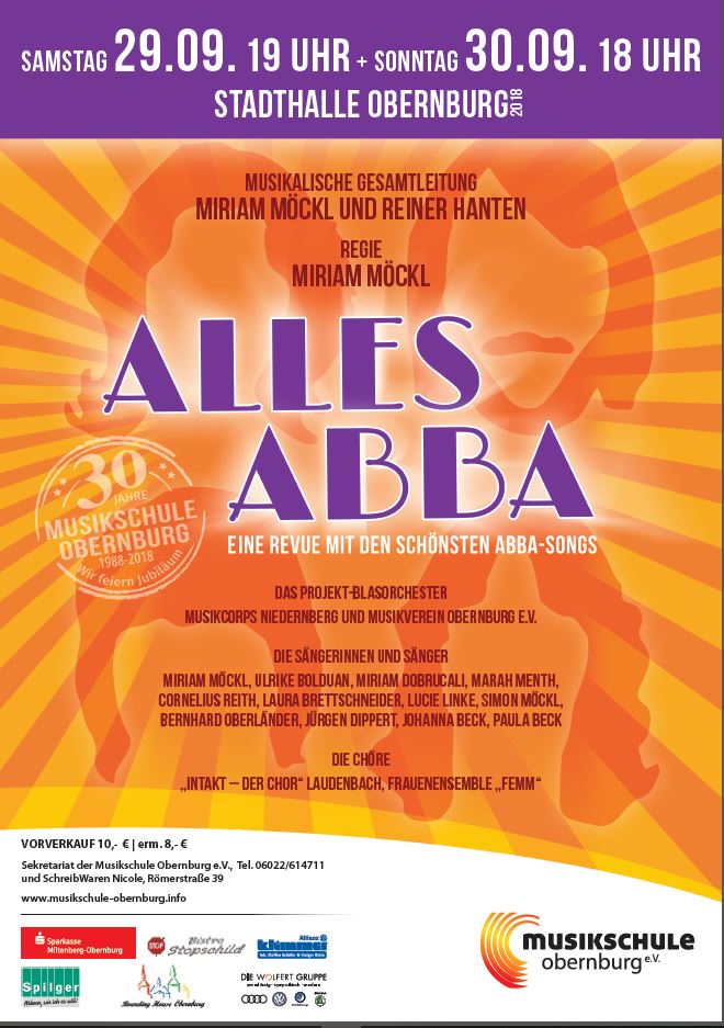 Unter der Leitung von Miriam Möckl und Reiner Hanten holen Gesangssolisten, ein Projektblasorchester (Musikverein Obernburg und Musikcorps Niedernberg), Band und die Chöre "Intakt - der Chor" und das Frauenensemble "Femm" die beliebten Songs von Agnetha, Anni-Frid, Benny & Björn auf die Bühne der Obernburger Stadthalle - ein Highlight im Jubiläumsjahr der Musikschule Obernburg, das Sie sich nicht entgehen lassen sollten.