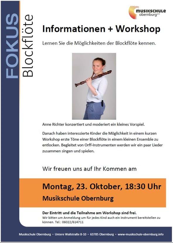Danach haben interessierte Kinder die Möglichkeit in einem kurzen Workshop erste Töne einer Blockflöte in einem kleinen Ensemble zu entlocken. Begleitet von Orff-Instrumenten werden wir ein paar Lieder zusammen singen und spielen.